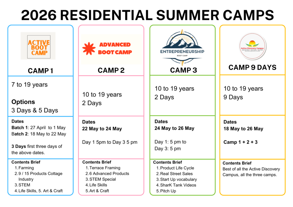Note:For more information reach us on what’s app at 6300662113 or 9652222119 mention for School or college or individual learner. All visits & participations are only on pre-booking.The delivery of subject shall be age & grade appropriate.Food service is available on pre-booking. Reach us on what’s app at 6300662113Things to get for normal workshop are:1. Food, 2. Extra Pair of dress, 3. Hat/Cap, 4. Water Bottle & respective workshopMake sure to check availability, block your date & get conformation on what’s app & participate. Please be informed we don’t have any branches & check for our Sun & wings logo for service expectations. Thank you. Click here for more details Click here for more information on Entrepreneurship Camp Click here